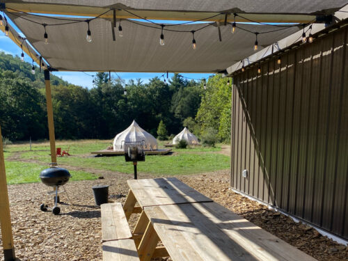 Two full bathrooms, fridge + freezer space, lots of other amenities, and picnic area for Meadow Yurt Guests. Snacks and goodies are also available for purchase in the kitchenette.