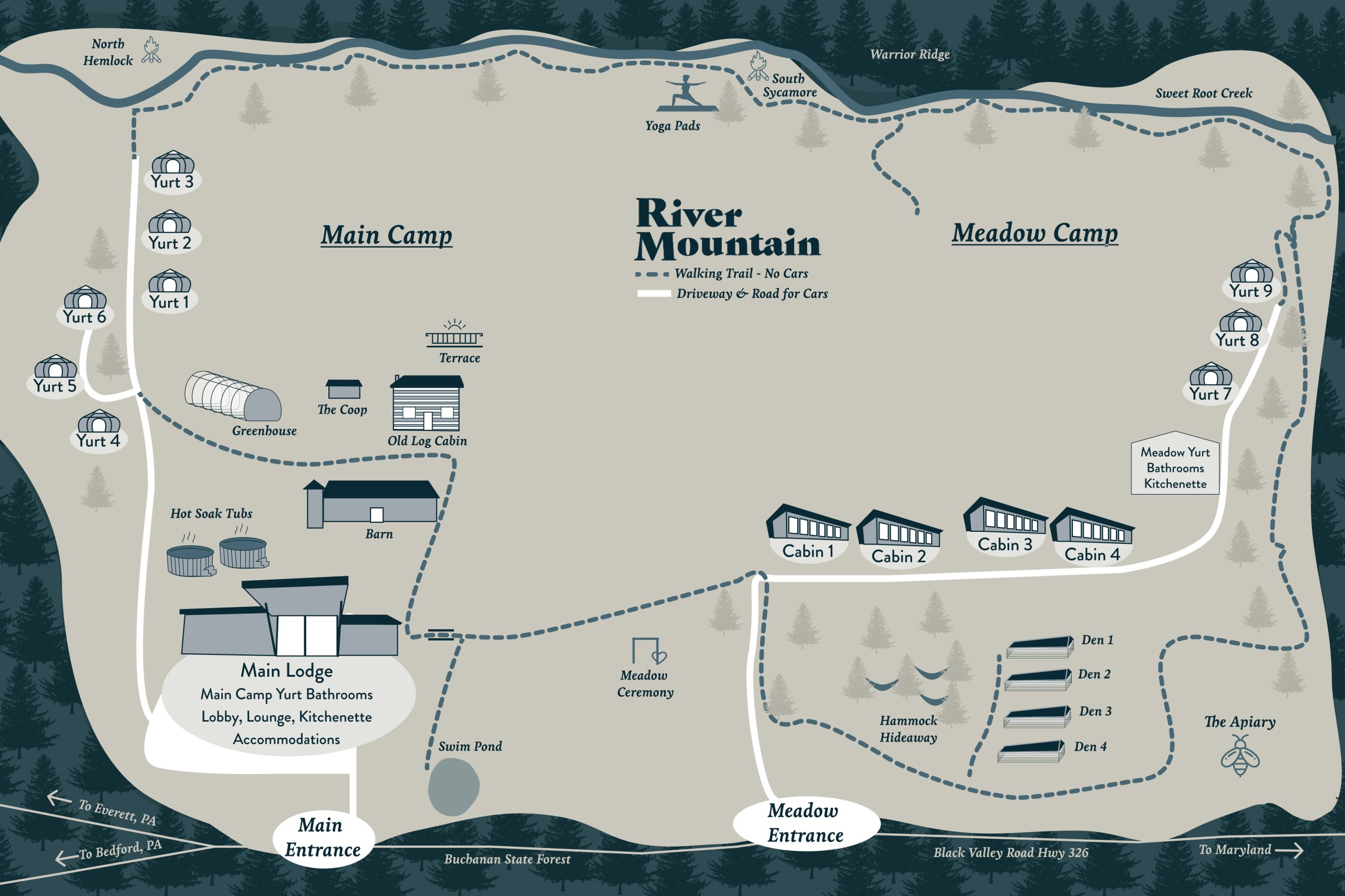 Our yoga platforms are located along Sweet Root Creek and our River Mountain hiking trail. Available for yoga retreats and group rentals, as well as individual guest use when not reserved by a group or retreat.
